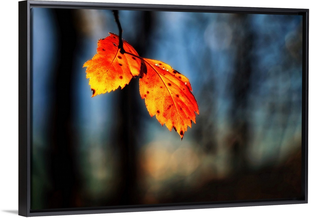<p>Photograph of two orange and yellow leaves hanging from a branch with a shallow depth of field.</p>