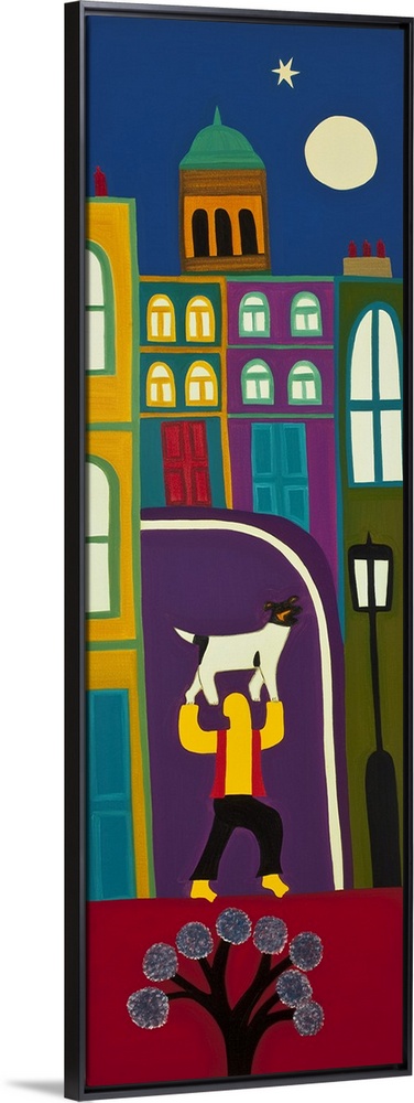 <p>Contemporary painting of a person holding a dog in a city.</p>