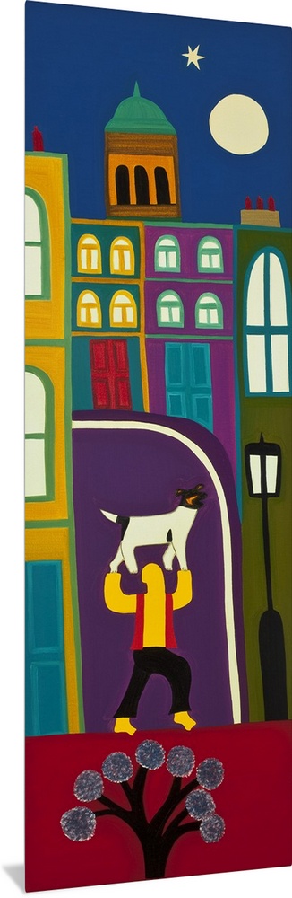 <p>Contemporary painting of a person holding a dog in a city.</p>