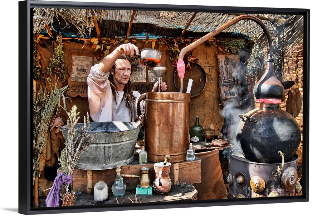 <p>A man distilling chemicals using an alembic vessel.</p>