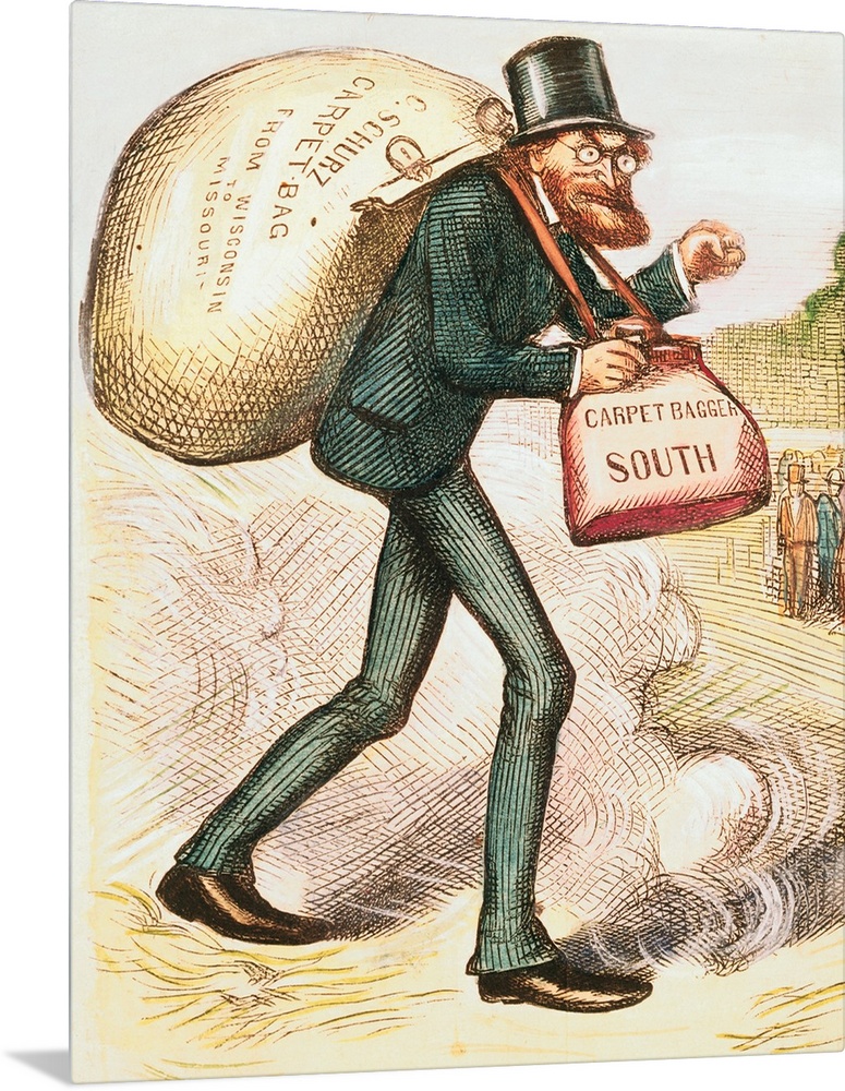 <p>1872 Harper's Weekly political cartoon of Carl Schurz depicted as a carpetbagger, which reflected Southern attitudes toward Northerners during Reconstruction.</p>