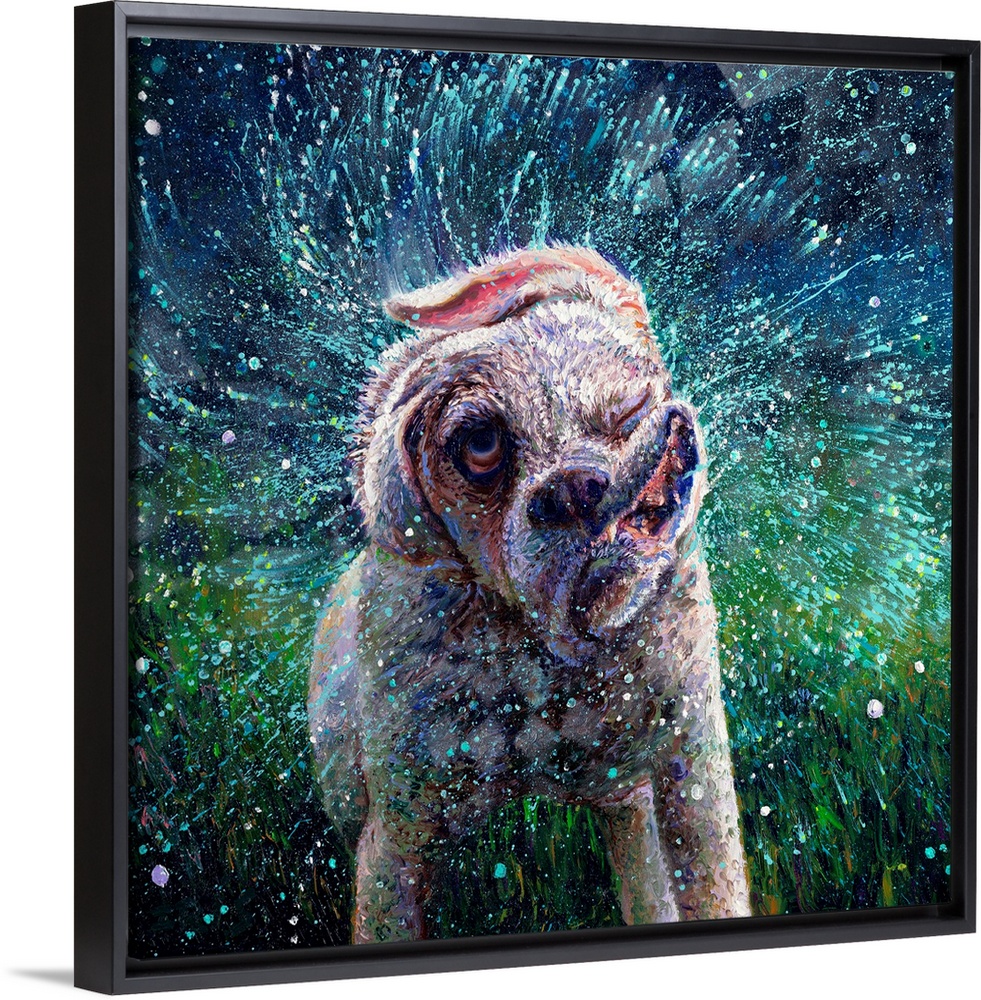 <p>Brightly colored contemporary artwork of a white dog shaking off water.</p>