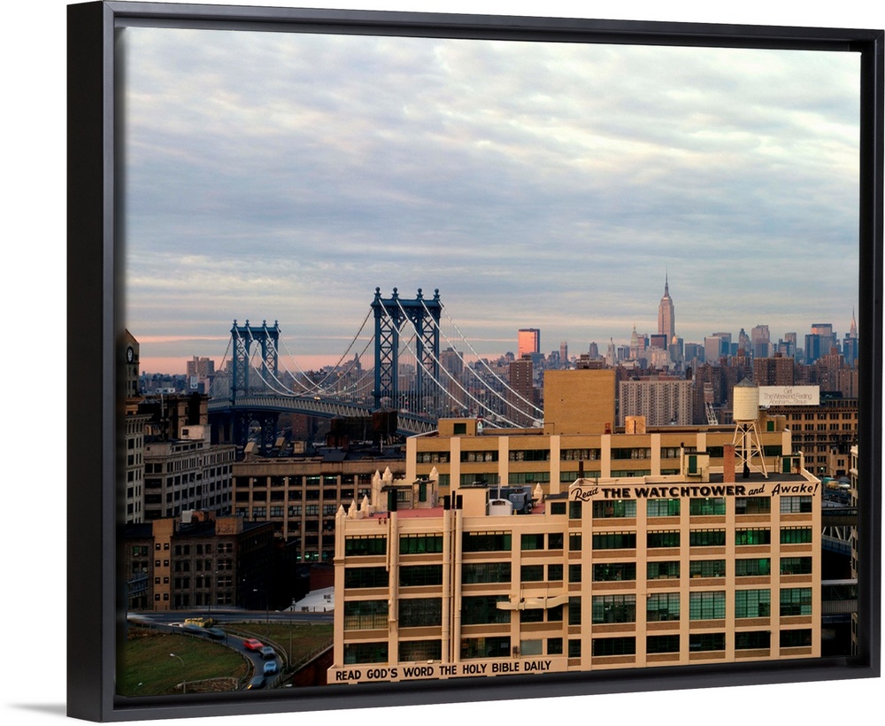 <p>The Manhattan Bridge and Watchtower building, with the Manhattan skyline in the background. Photograph by Jet Lowe, 1991.</p>