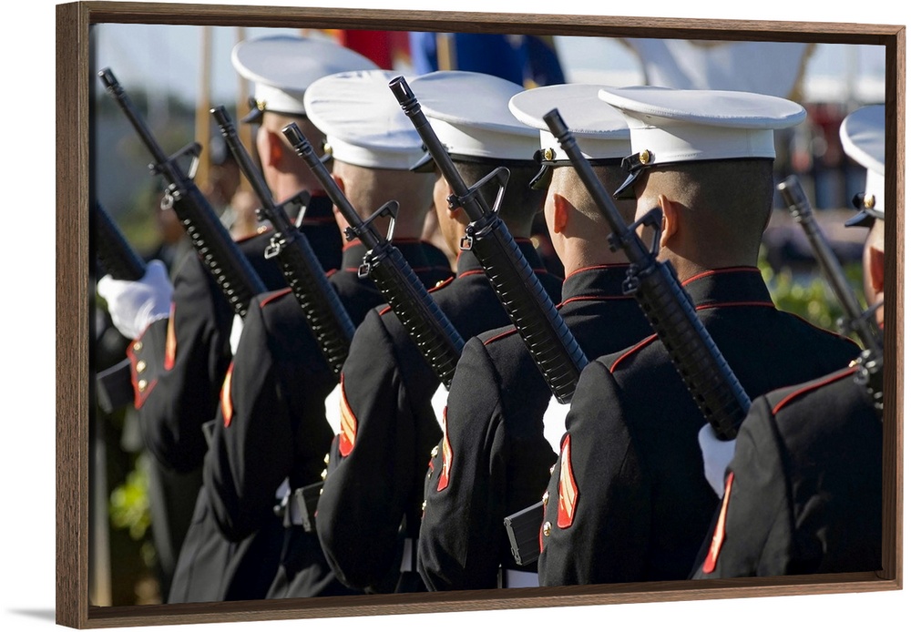<p>Big canvas photo of Marines holding rifles lined up facing away from the camera.</p>