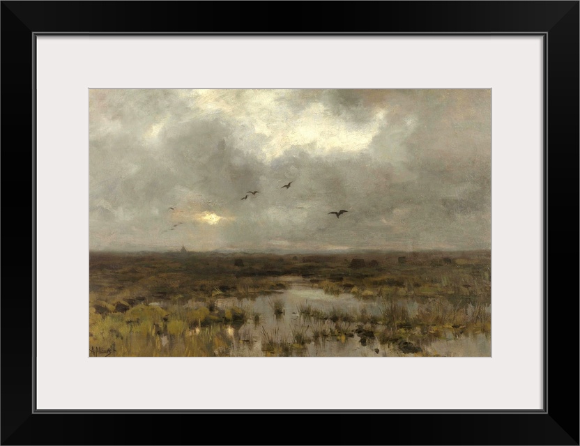 <p>The Marsh, Anton Mauve, c. 1885-88, Dutch painting, oil on canvas. Overcast landscape with a marsh and a few birds.</p>