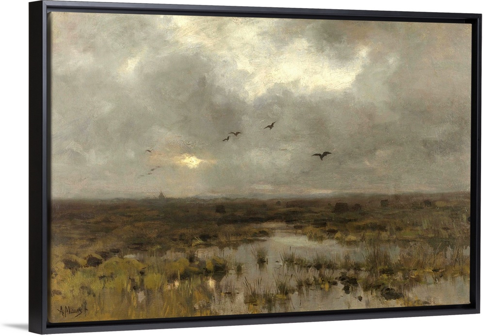 <p>The Marsh, Anton Mauve, c. 1885-88, Dutch painting, oil on canvas. Overcast landscape with a marsh and a few birds.</p>