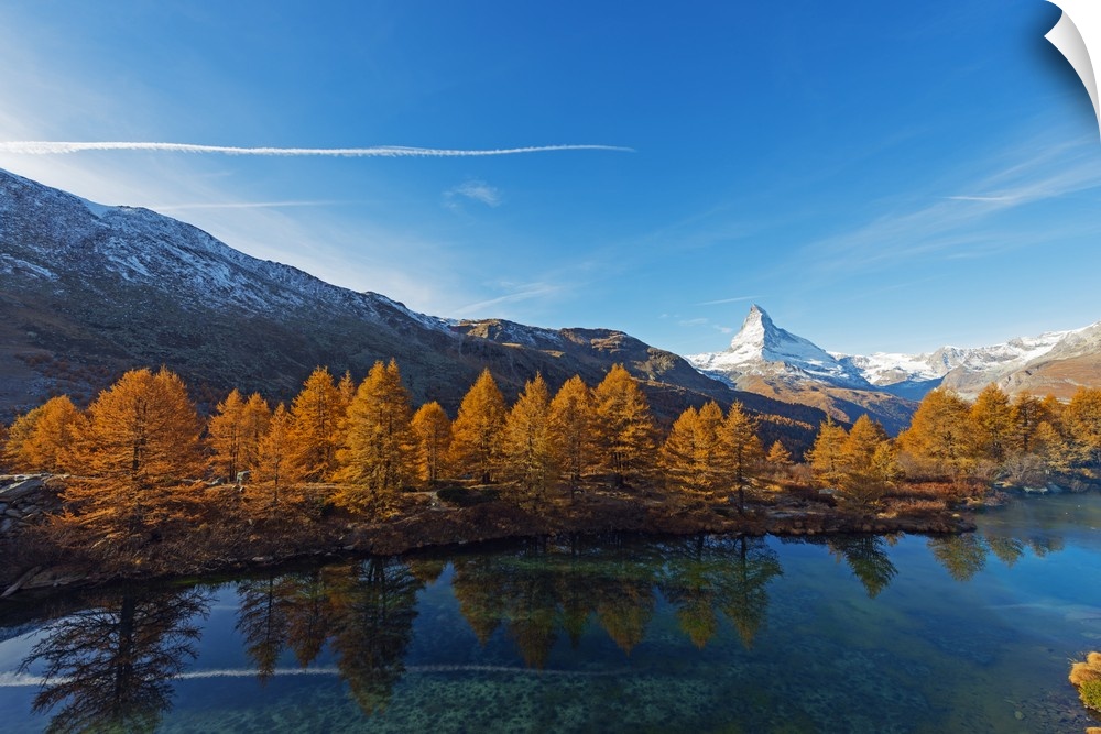 <p>The Matterhorn, 4478m, and Grindjisee mountain lake in autumn, Zermatt, Valais, Swiss Alps, Switzerland, Europe</p>