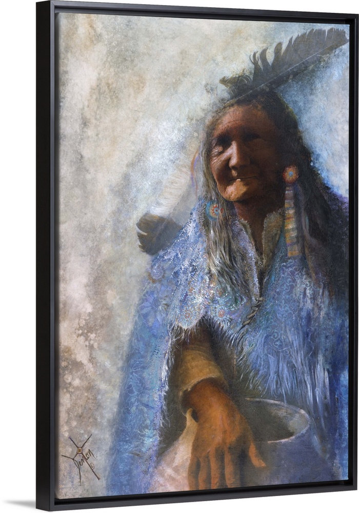 <p>A contemporary painting of a Native American woman draped in a blue blanket while holding a large pot.</p>