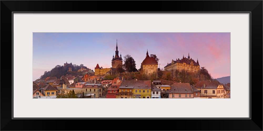 <p>The Medieval Old Town of Sighisoara illuminated at sunrise, Sighisoara, Transylvania, Romania</p>