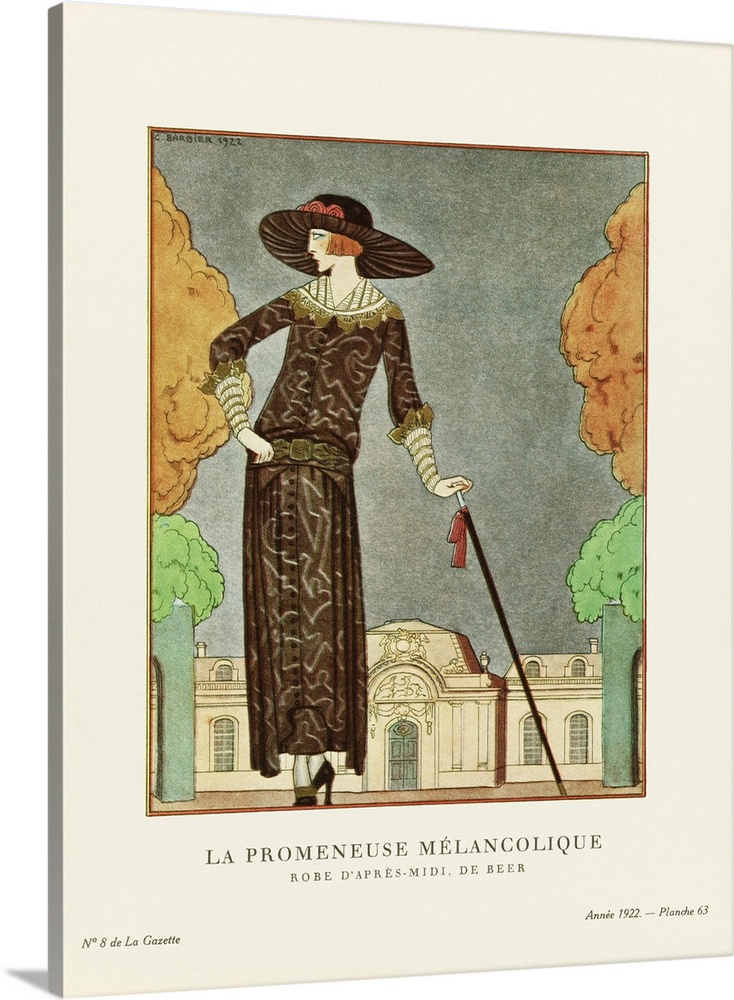<p>La Promeneuse Melancolique. The Melancholy Walker. Robe d'apres-midi, de Beer. Afternoon dress by Beer. Art-deco fashion illustration by French artist George Barbier, 1882-1932. The work was created for the Gazette du Bon Ton, a Parisian fashion magazine published between 1912-1915 and 1919-1925.</p>