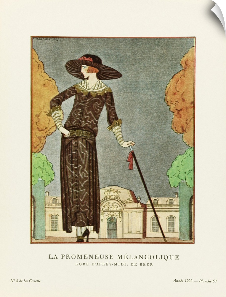 <p>La Promeneuse Melancolique. The Melancholy Walker. Robe d'apres-midi, de Beer. Afternoon dress by Beer. Art-deco fashion illustration by French artist George Barbier, 1882-1932. The work was created for the Gazette du Bon Ton, a Parisian fashion magazine published between 1912-1915 and 1919-1925.</p>