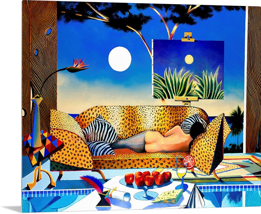 <p>Contemporary painting of a woman on an animal-print couch in the evening.</p>