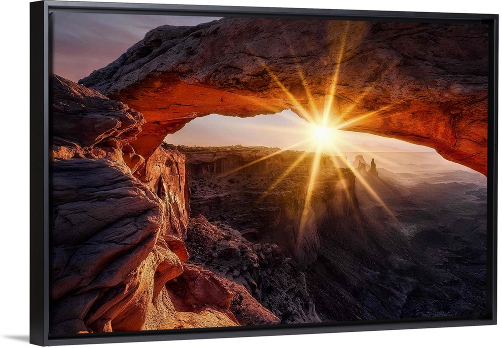 <p>A view through the Mesa Arch in the Canyonlands national park in Utah at sunrise.</p>