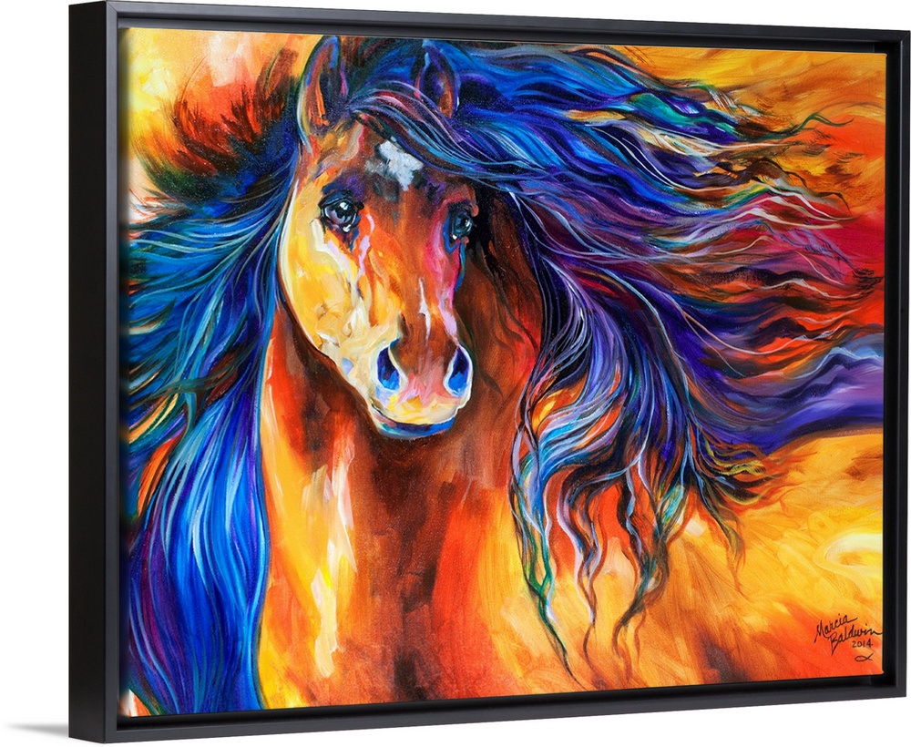 <p>Contemporary painting of a horse with a golden coat and a blue and purple mane blowing all around.</p>