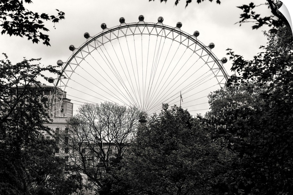 <p>Black and white photo of the London Eye behind trees in London, England.</p>