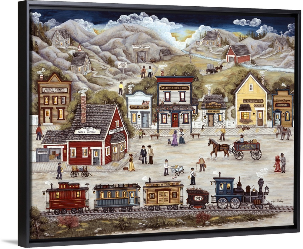 <p>A mining town with town folks walking and working, horses, trains, mountain, river.</p>