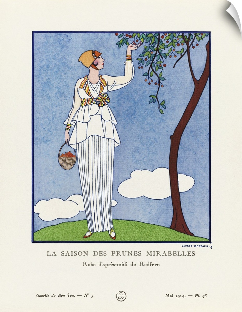<p>La Saison des Prunes Mirabelles. The Mirabelle plum season. Robe d'apres-midi de Redfern. Art-deco fashion illustration by French artist George Barbier, 1882-1932. The work was created for the Gazette du Bon Ton, a Parisian fashion magazine published between 1912-1915 and 1919-1925.</p>