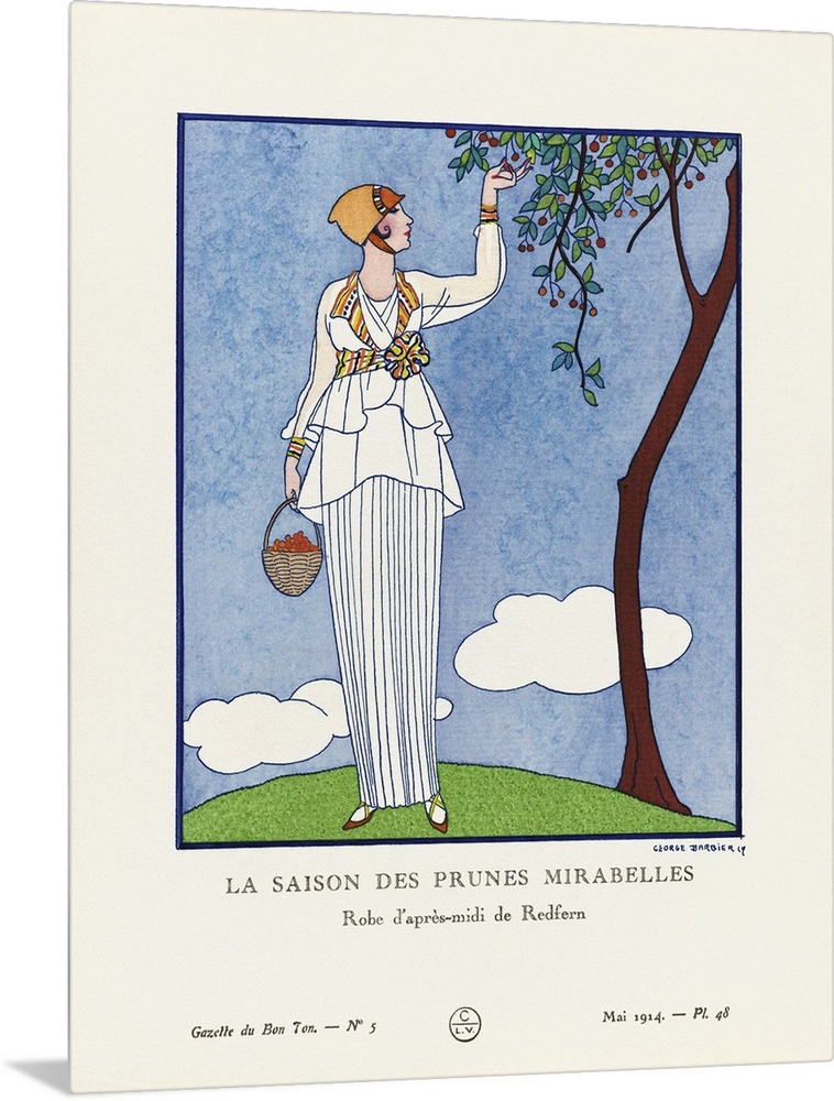 <p>La Saison des Prunes Mirabelles. The Mirabelle plum season. Robe d'apres-midi de Redfern. Art-deco fashion illustration by French artist George Barbier, 1882-1932. The work was created for the Gazette du Bon Ton, a Parisian fashion magazine published between 1912-1915 and 1919-1925.</p>