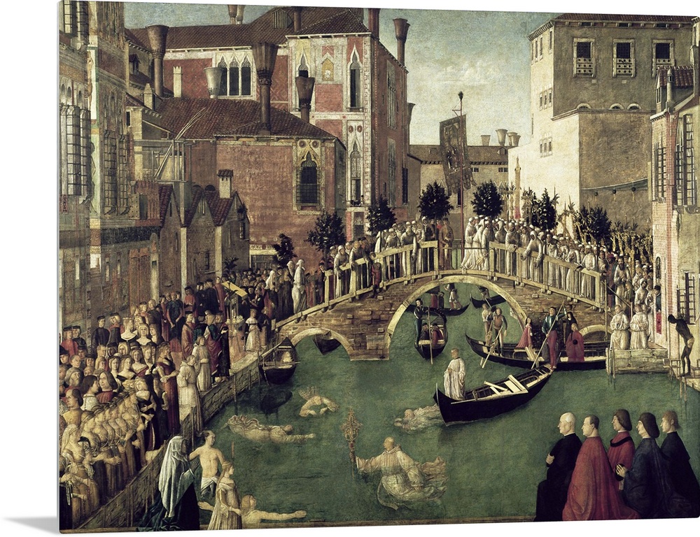 <p>XIR58302 The Miracle of the Cross on San Lorenzo Bridge, 1500 (oil on canvas) (for detail see 61115) by Bellini, Gentile (c.1429-1507); 323x430 cm; Galleria dell' Accademia, Venice, Italy; (add. info.: Miracles of the Cross series - see also 59423 and 60684; from the School of St. John the Evangelist; Miracle de la Sainte-Croix au Pont de San Lorenzo); Giraudon; Italian, out of copyright</p>