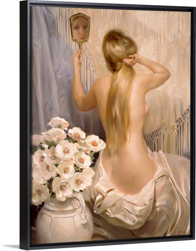 <p>back view of a woman partially covered with a cloth looking in mirror, sitting next to vase of flowers</p>