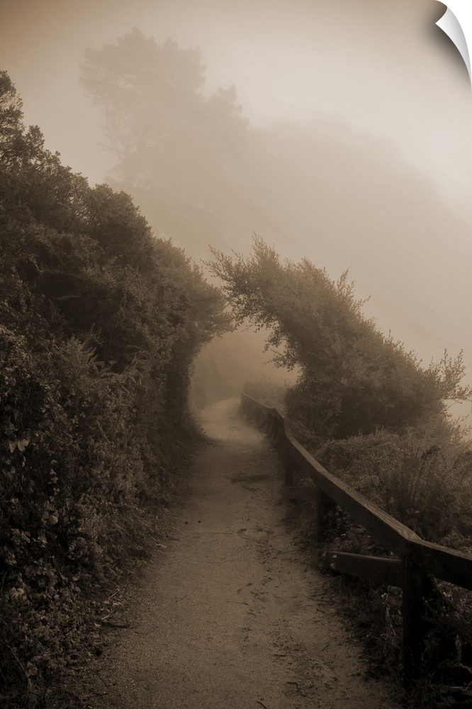 <p>A path follows a course in the Big Sur coastal region, in a fog</p>