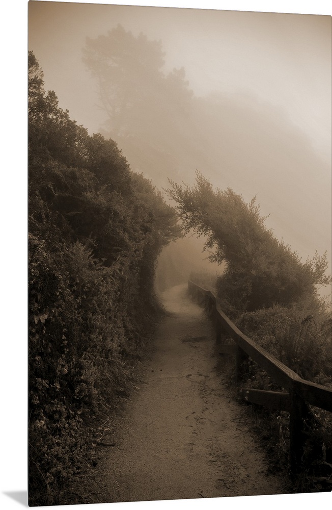 <p>A path follows a course in the Big Sur coastal region, in a fog</p>