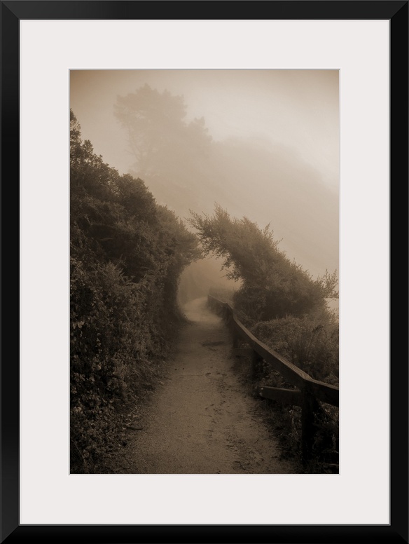<p>A path follows a course in the Big Sur coastal region, in a fog</p>