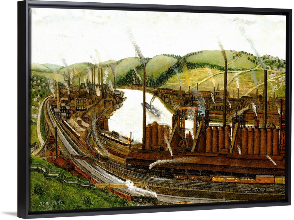 <p>The Monongahela River Valley, Pennsylvania is one of several paintings by Kane that celebrate the ever-growing industrialization of the American landscape during the 1930s. He was intimately acquainted with Pittsburgh's heavy industries, having worked for both the steel industry and the railroad. Despite the loss of part of a leg in a railroad-related accident, his enthusiasm for Pittsburgh's industry and landscape was never extinguished. The scene represented by the painting fairly hums with activity. Four railroad trains, one clearly marked with the name of the local rail line, Baltimore and Ohio, pass swiftly along an intricate maze of tracks, while nearby trolley cars and boxcars wait for clear passage. Echoing this movement is a large paddle-wheel steamboat pushing a barge upriver. On either side of the meandering river, the dark buildings of the steel mills spread across the landscape, their billowing smokestacks lending vertical accents to the horizontal composition.</p>