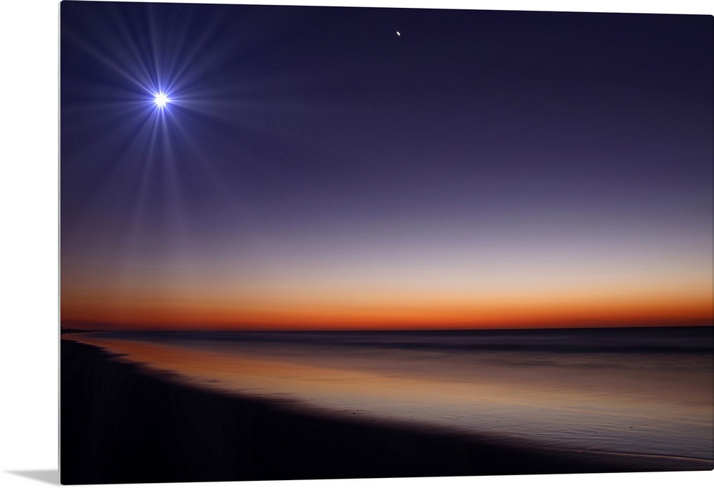 <p>Big photo on canvas of a bright moon and Venus in the dusk sky above an ocean.</p>