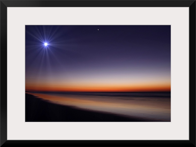 <p>Big photo on canvas of a bright moon and Venus in the dusk sky above an ocean.</p>