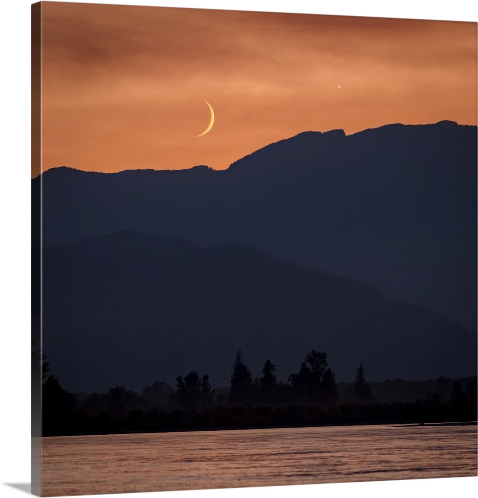 <p>The moon and Venus in an orange sky over the silhouetted mountains, Fraser Valley; Vancouver, British Columbia, Canada</p>