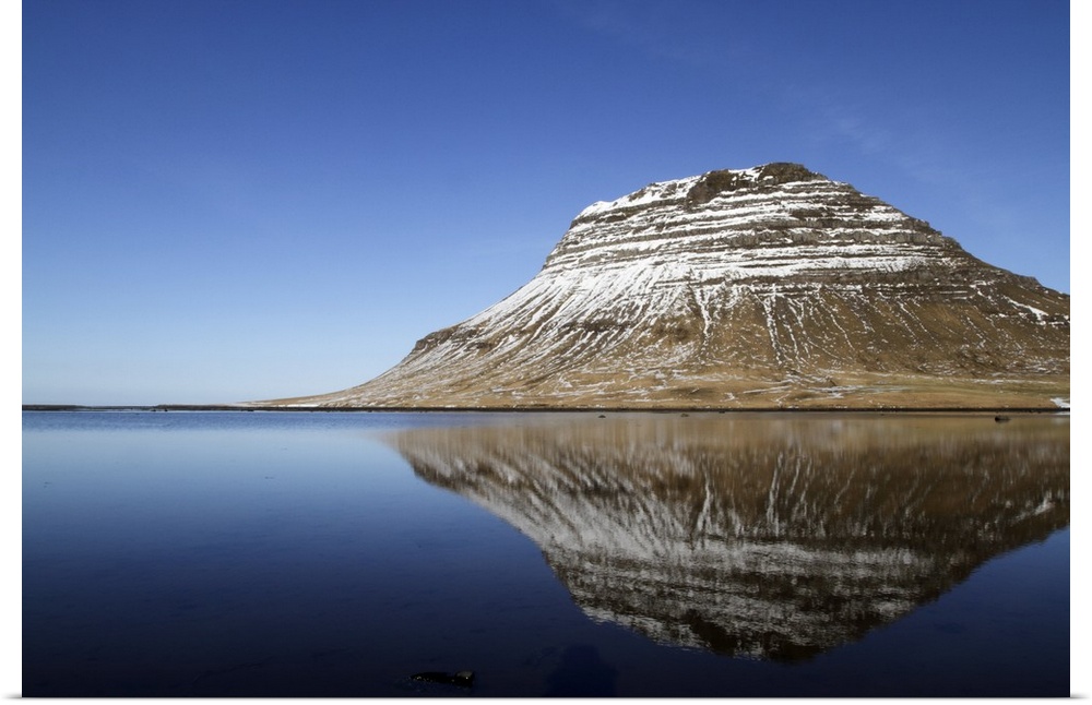 <p>The mountain of Kirkjufell reflected in the waters of Halsvadali, Snaefellsnes Peninsula, Iceland.</p>