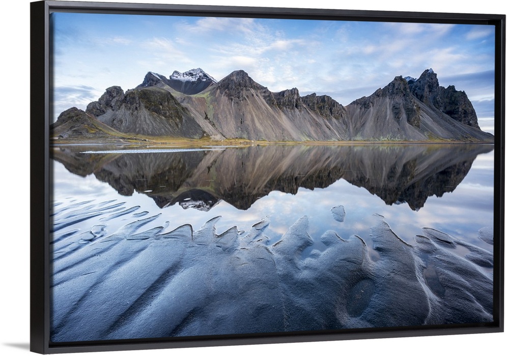 <p>The mountains reflect on the surface of the ocean. Stokksnes, Eastern Iceland, Europe.</p>