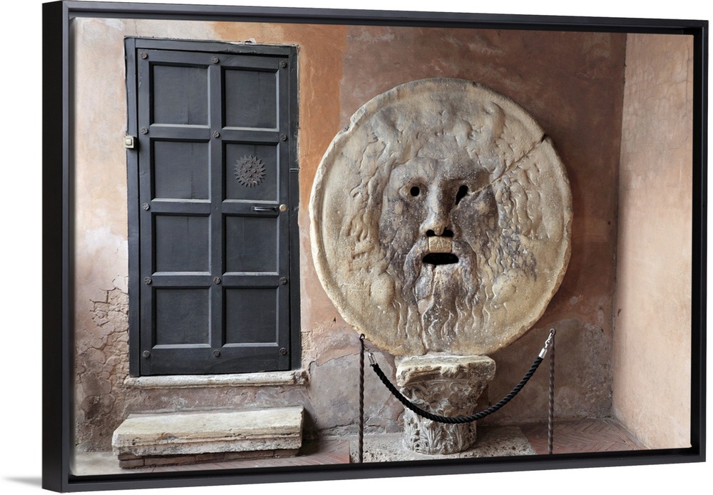 <p>Horizontal photograph on a large canvas of the a metal door next to the roped off sculpture "The Mouth of Truth", in Rome, Lazio, Italy.</p>