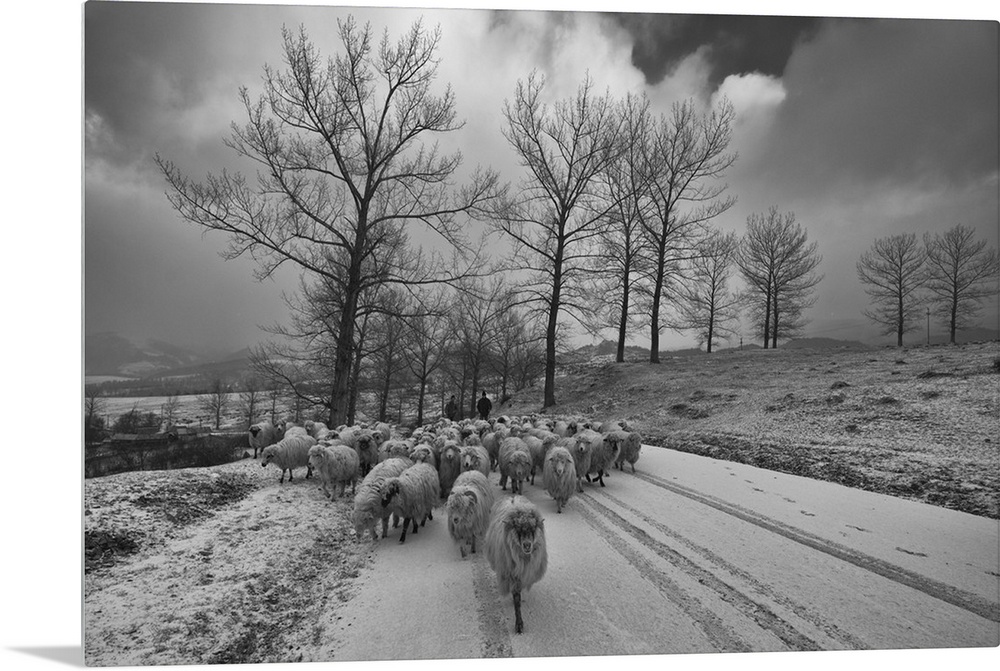 <p>Sheep herd on the move in this snowy winter landscape.</p>