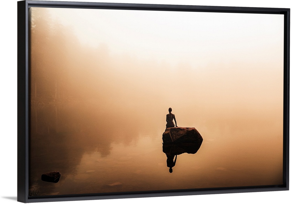 <p>Foggy landscape with the sculpture of a woman reflected in the water</p>