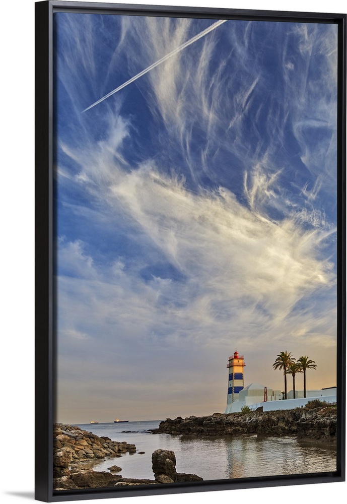 <p>The museum of Farol de Santa Marta Lighthouse at sunset with wispy cloudy formations, Santa Marta, Abuxarda, Lisbon, Lisboa, Portugal.</p>