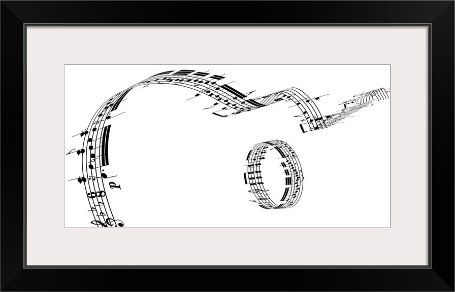 <p>A stream of music notes runs across this print with a circle of music notes just below it making an outline of part of a guitar.</p>