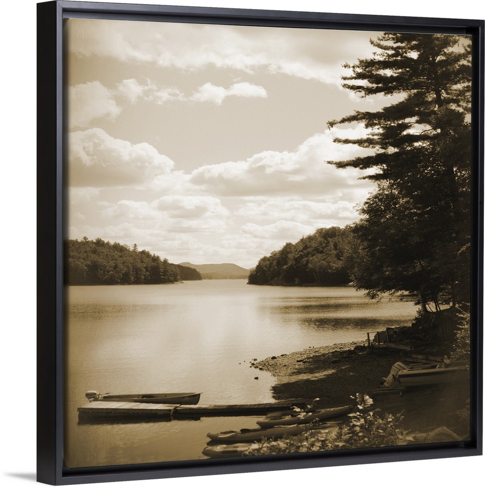 <p>Sepia toned photograph of an idyllic wilderness scene, with lake and forest.</p>