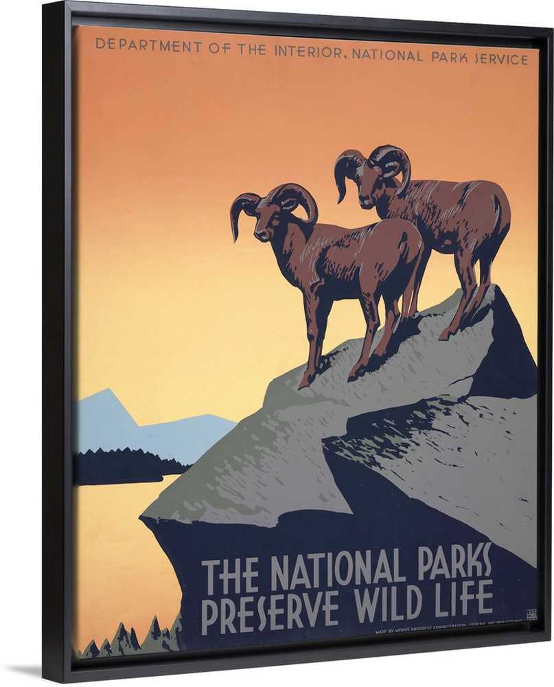 <p>The national parks preserve wild life. Poster for National Park Service promoting travel to national parks, showing two bighorn sheep. Library of Congress, Prints and Photographs Division, WPA Poster Collection.</p>