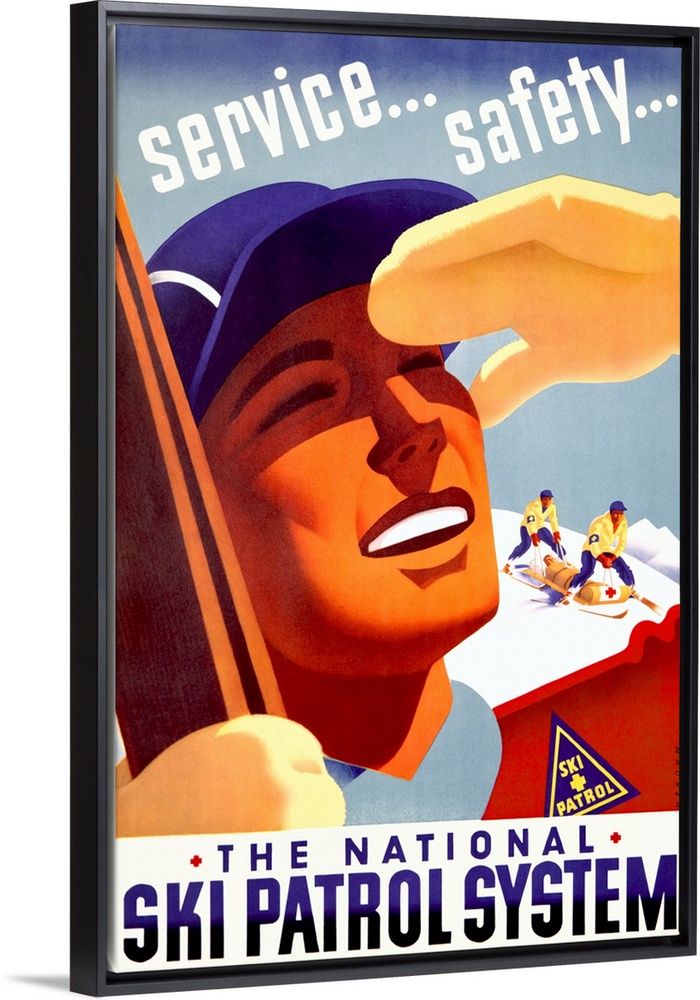 <p>Vertical, large vintage advertisement for The National Ski Patrol System, a close up of a ski patrol member looks off to the distance for skiers needing assistance, while two members in the background tend to an injured skier on a stretcher. Text at the top of the image reads "service...safety...".</p>