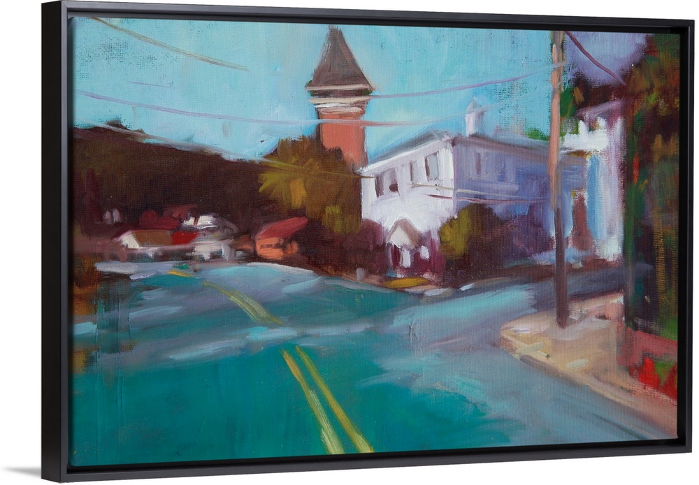 <p>Contemporary painting of a street intersection with buildings all around.</p>