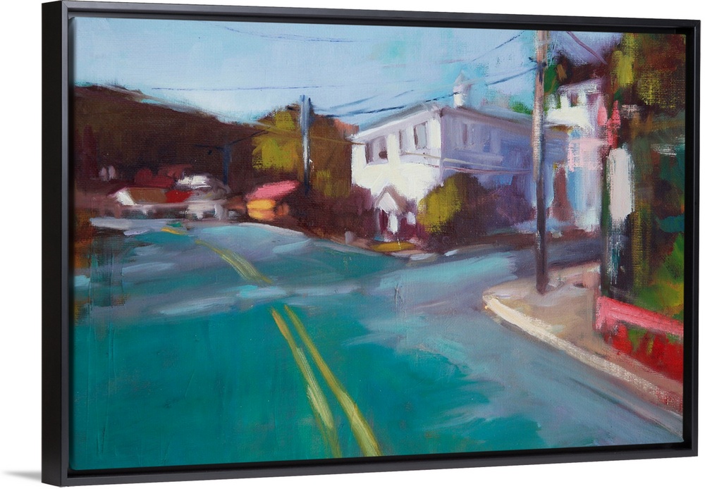 <p>Contemporary painting of intersecting roads in a neighborhood surrounded by houses.</p>