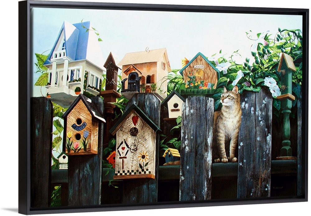<p>A cat sitting on a fence with birdhouses waiting for the birds to return.</p>