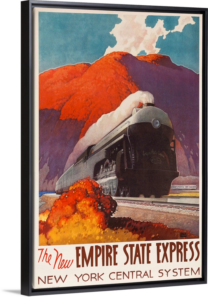 <p>Travel poster for the New York Central System Rail showing a steaming locomotive engine pulling a long train of passenger rail cars. 1941 Ilustrated by Leslie Ragan</p>