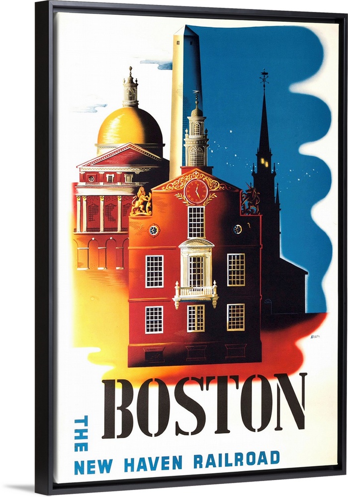 <p>Illustrated by Ben Nason, The Old North Church, Old State House, and the new State House in day and night scenes advertising travel to Boston on The New Haven Railroad</p>