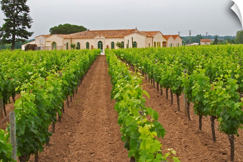 <p>The newly renovated Chateau Petrus seen across its vineyards planted with rows of Merlot vines Pomerol Bordeaux Gironde Aquitaine France</p>