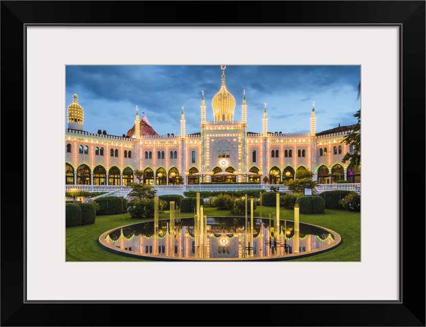<p>Tivoli gardens, Copenhagen, Hovedstaden, Denmark. The Nimb Hotel illuminated at dusk in summer.</p>
