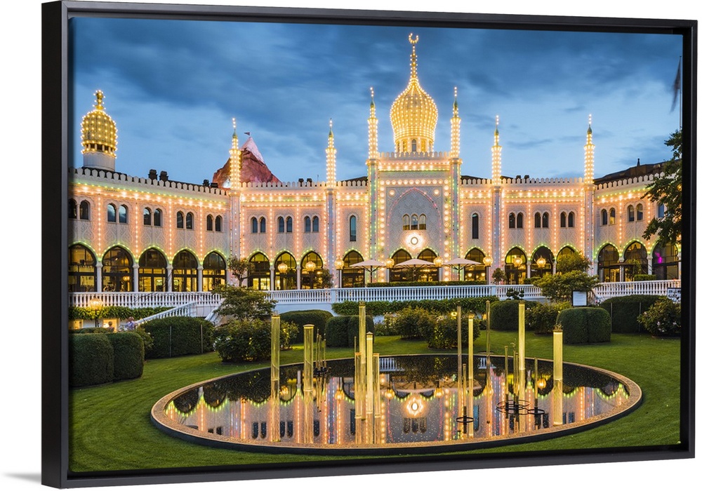 <p>Tivoli gardens, Copenhagen, Hovedstaden, Denmark. The Nimb Hotel illuminated at dusk in summer.</p>