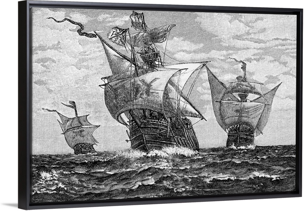 <p>Christopher Columbus' flagship, the Santa Maria, (1451-1506) and his companion ships The Pinta and the Nina approaching land. Undated Woodcut.</p>